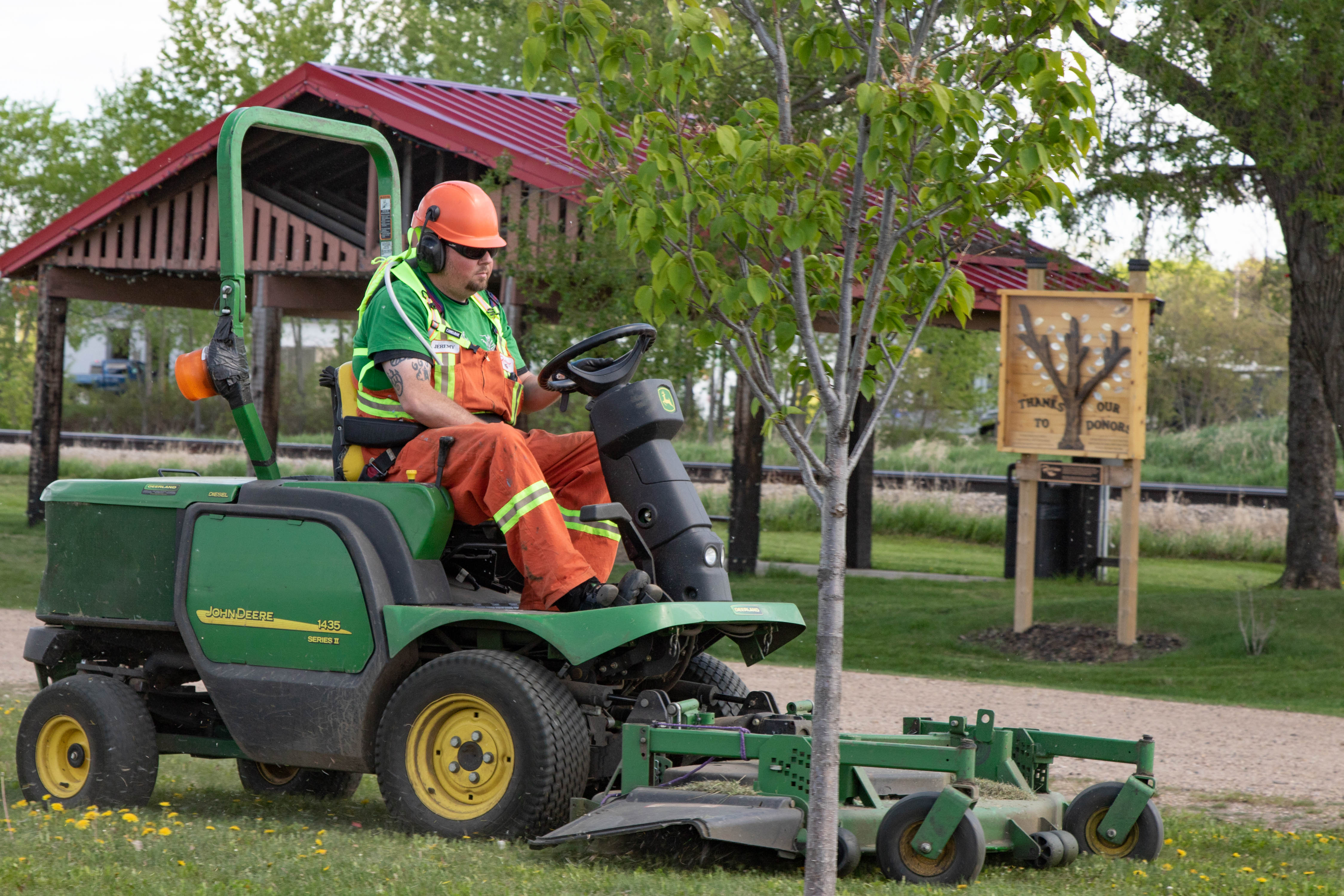 Town of Redwater maintenance worker Jeremy Pifko operates a John Deere lawn mower at...